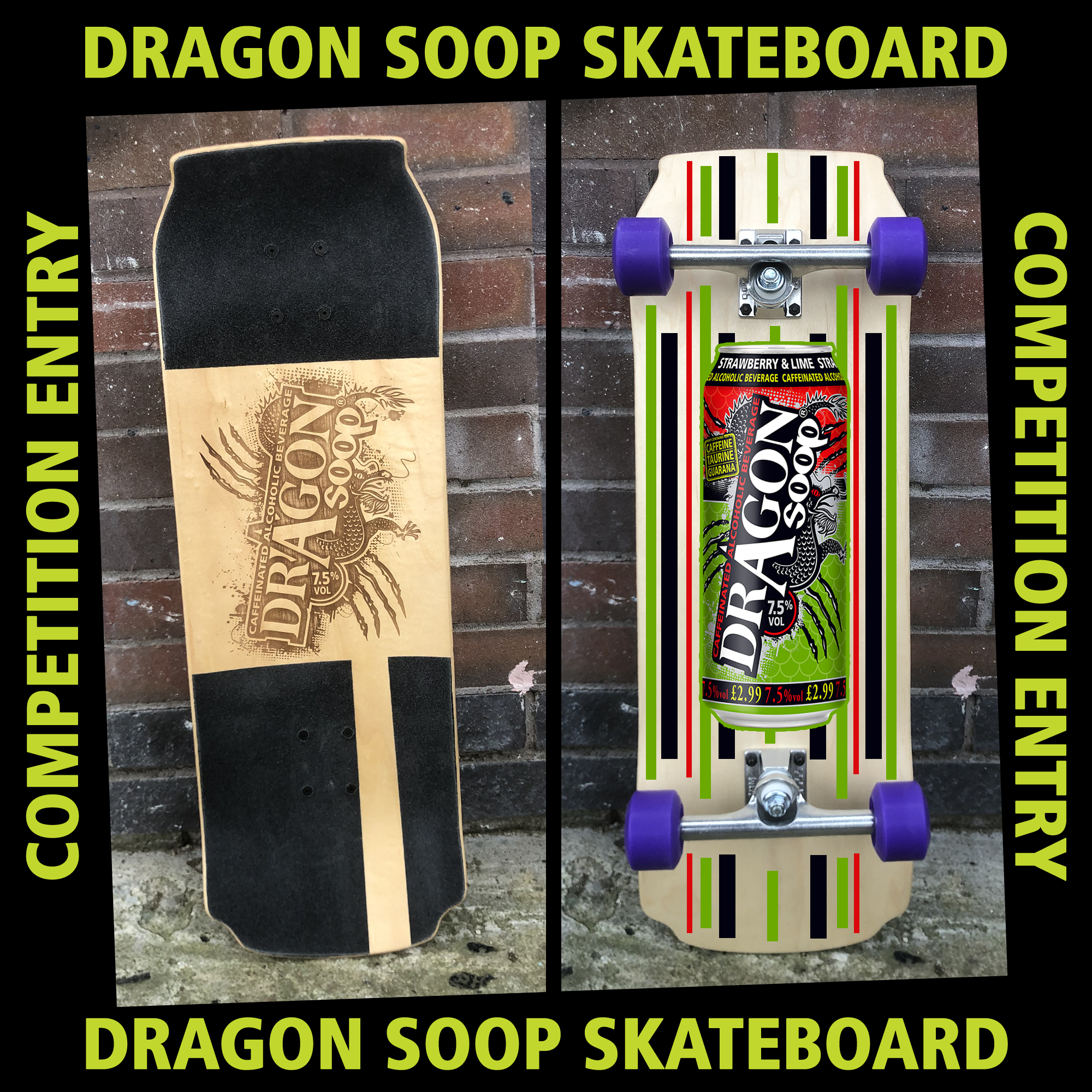 Once your design is complete, post it in a public comment on the pinned skateboard competition post on the official Dragon Soop Facebook* OR Twitter* profile.